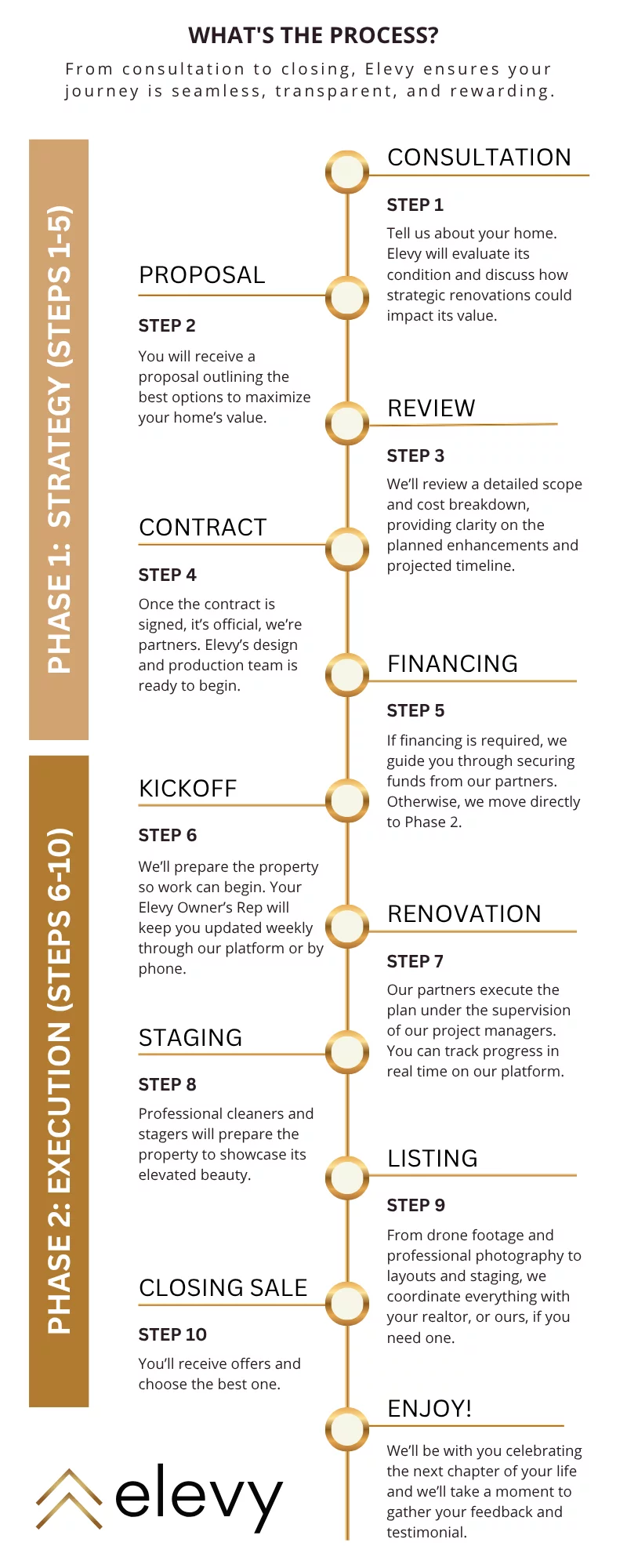 A: Elevy will provide you with a full execution plan in which we will make sure to allocate the right amount of renovations needed to unlock the maximum equity. In every asset there's a comparable amount of similar homes sold in the area from where you can get a very clear idea of what the sale price will be. Elevy can minimize risk but not eliminate it completely.